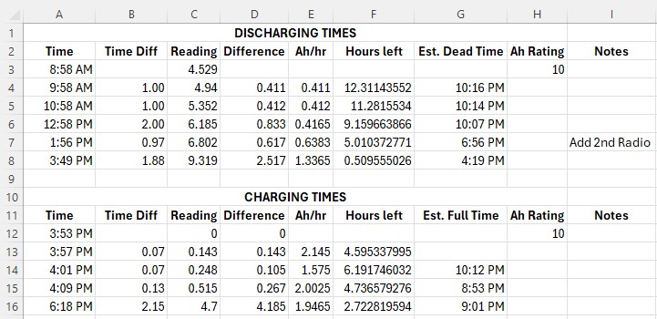 The Time and Reading columns are simple entry columns. I calculate the difference between readings, times, and amps per hour it is using, which are all pretty straight forward. The only part that I had to look up was dealing with time as both a time and a decimal. I will list all formulas below for any who are new to Excel. You can also click the image below to download the spreadsheet to your computer.